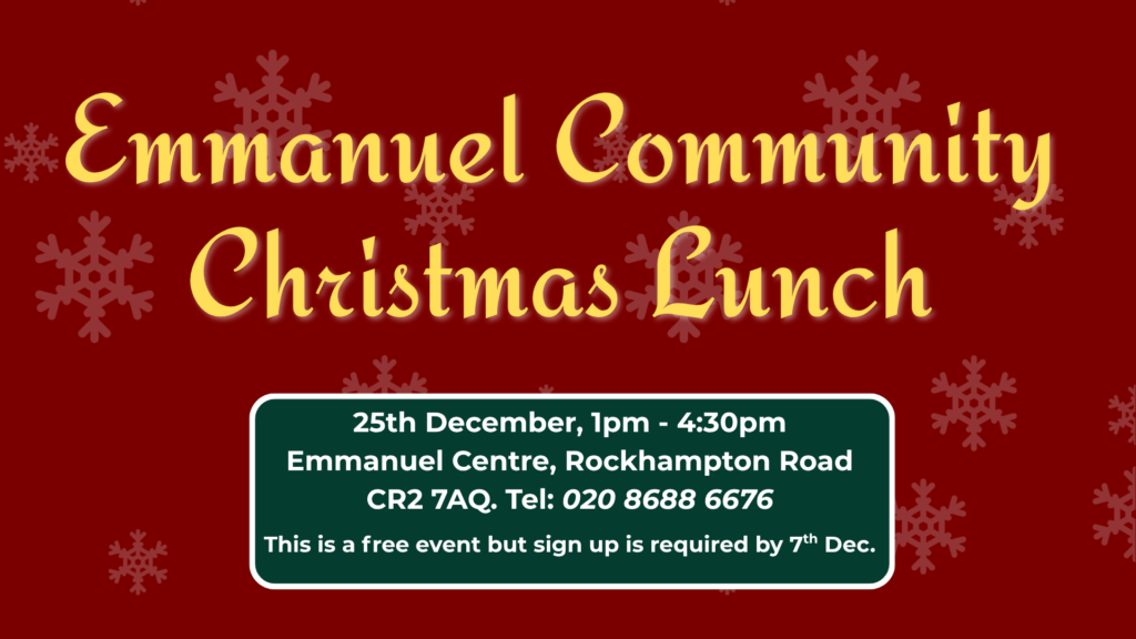 This year for the first time we’ll doing a Christmas Lunch at Emmanuel in order to reach out to our local community! To make it happen we need your help. If you would like to help on the day – even if it is just for an hour or take part in preparations on Christmas eve, please contact Sally-Ann, she would love to hear from you. If you have anyone you know who would be blessed by coming to Christmas Day Lunch, we have a flyer with the details available from the welcome desk that you can use to invite them!