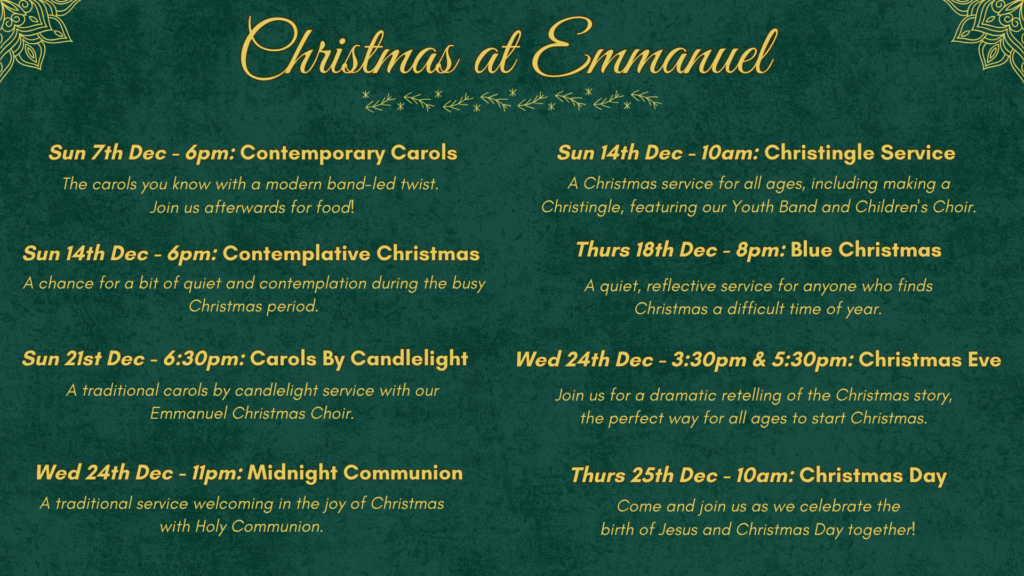 This Year we’ve got a wide range of services across our Sundays, as well as some extra midweek events. Whether you’re looking for a modern Christmas service like Contemporary Carol or a traditional one like Carols By Candlelight, or something quieter and reflect like Blue Christmas or full of fun for the whole family like Christmas Eve or Christingle, there’s definitely something for you to join at to celebrate and remember the birth of Jesus this Christmas!